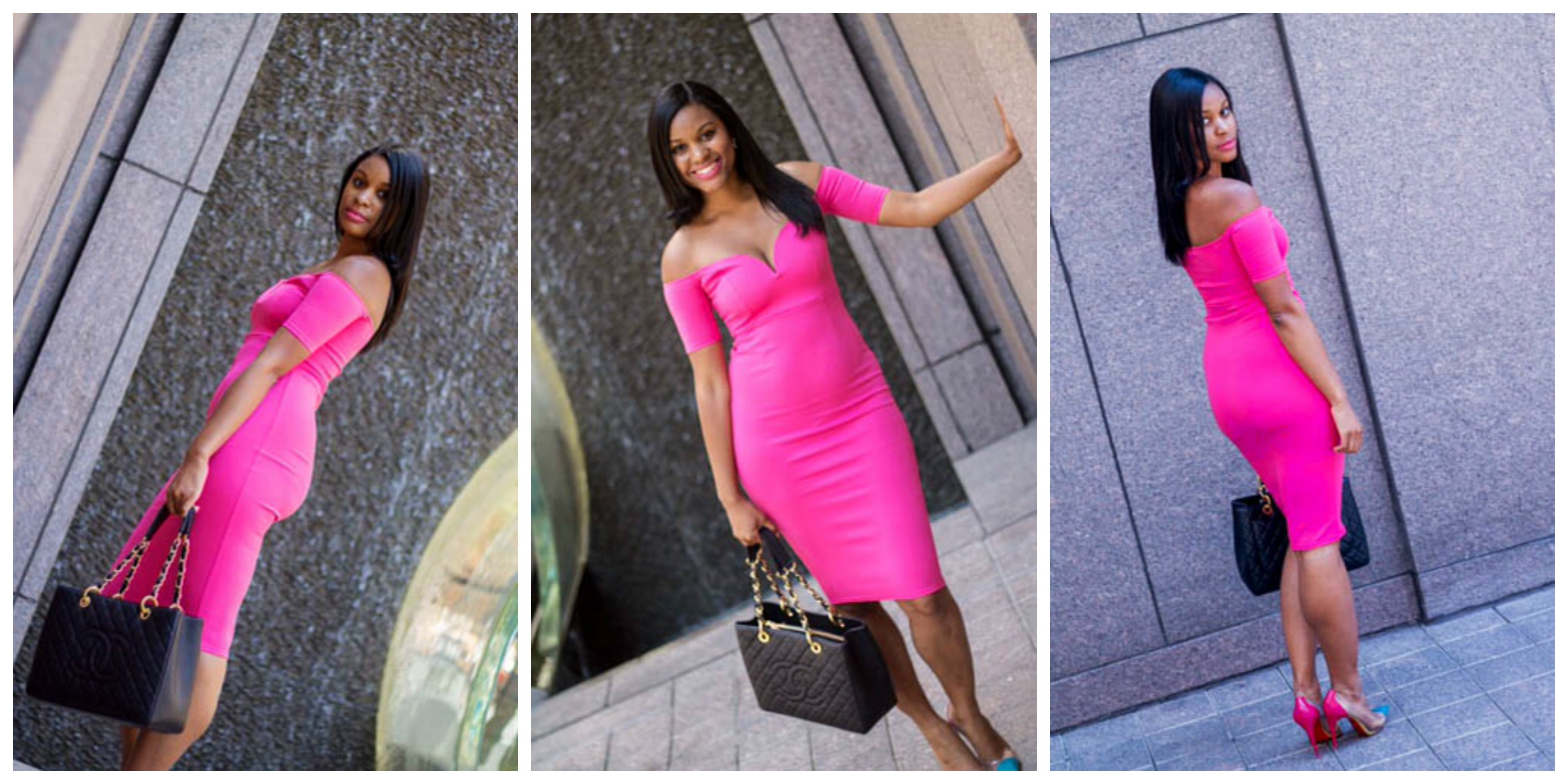 Since the weather has been so amazing these last couple of days here in NYC, I decided to keep the bright color summer trend going. Also New York Fashion Week kicked off yesterday & I wanted to make sure I dressed for the occasion. Even if your not on a runway you should dress as if you are. (At least that is my motto ) For those who are just getting to know me my favorite color is PINK! If I could wear pink everyday I would. LOL, but I digress… let’s get back to the deets of this outfit. I got this dress a couple of months ago from my favorite website since 2010 ASOS.com & it is the Oh My Love London brand (which I am so obsessed with). The scuba fit material hugs anyone with curves in all the right places without it being too constricting. It is very true to size I might add. I also paired it with my Christian Louboutin’s that have been waiting patiently to strut these NYC streets. This pair of Louboutin’s are actually my most comfortable; I was able to wear them all day. The shoes are more of a statement shoe than a classic because of the neon colors and plastic cut outs. This was actually my first time wearing these. Lastly, I paired it with my beloved Chanel GST in caviar leather & gold hardware. I feel anything Chanel instantly makes whatever your outfit is an instant classic. Hopefully you all enjoy this look as much as I do !