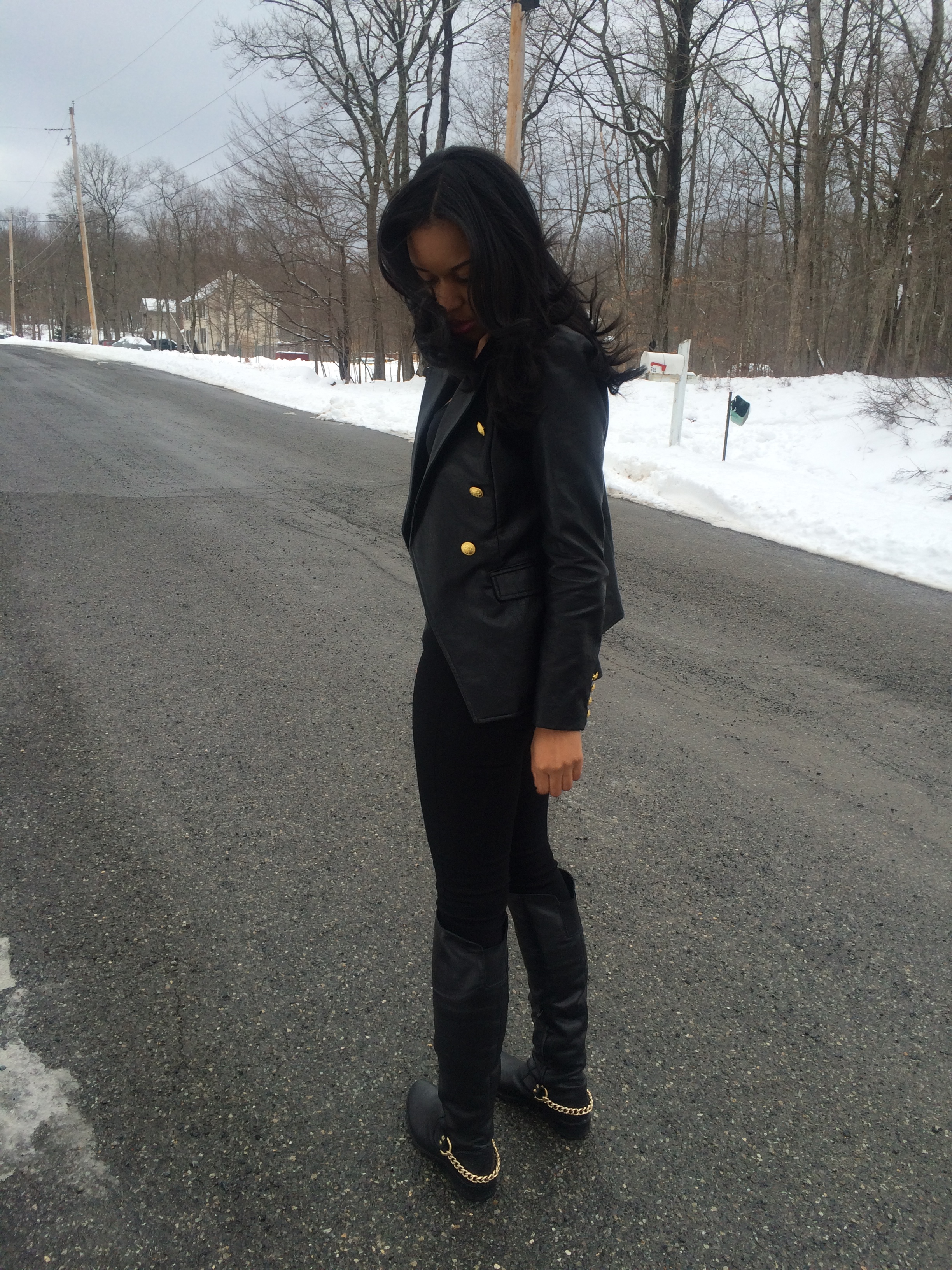 Lastly, I borrowed my sister’s black Steve Madden knee high leather gold chain boots to complete the look. Thank goodness we all wear the same size LOL.